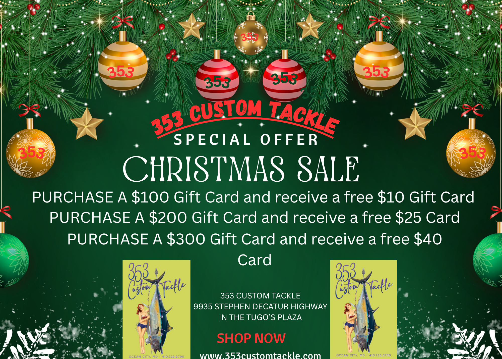 353 Custom Tackle is a local owned small business based out of Ocean City, MD. Our store specializes in custom rigging, custom dredges, spreader bars, teasers & daisy chains. We love to support & promote local vendors, artists, and small business owners emphasizing on the craftsmanship of handmade products. We cater to all levels of fishing and we have an open door teaching facility. Give us a call we would be happy to help!