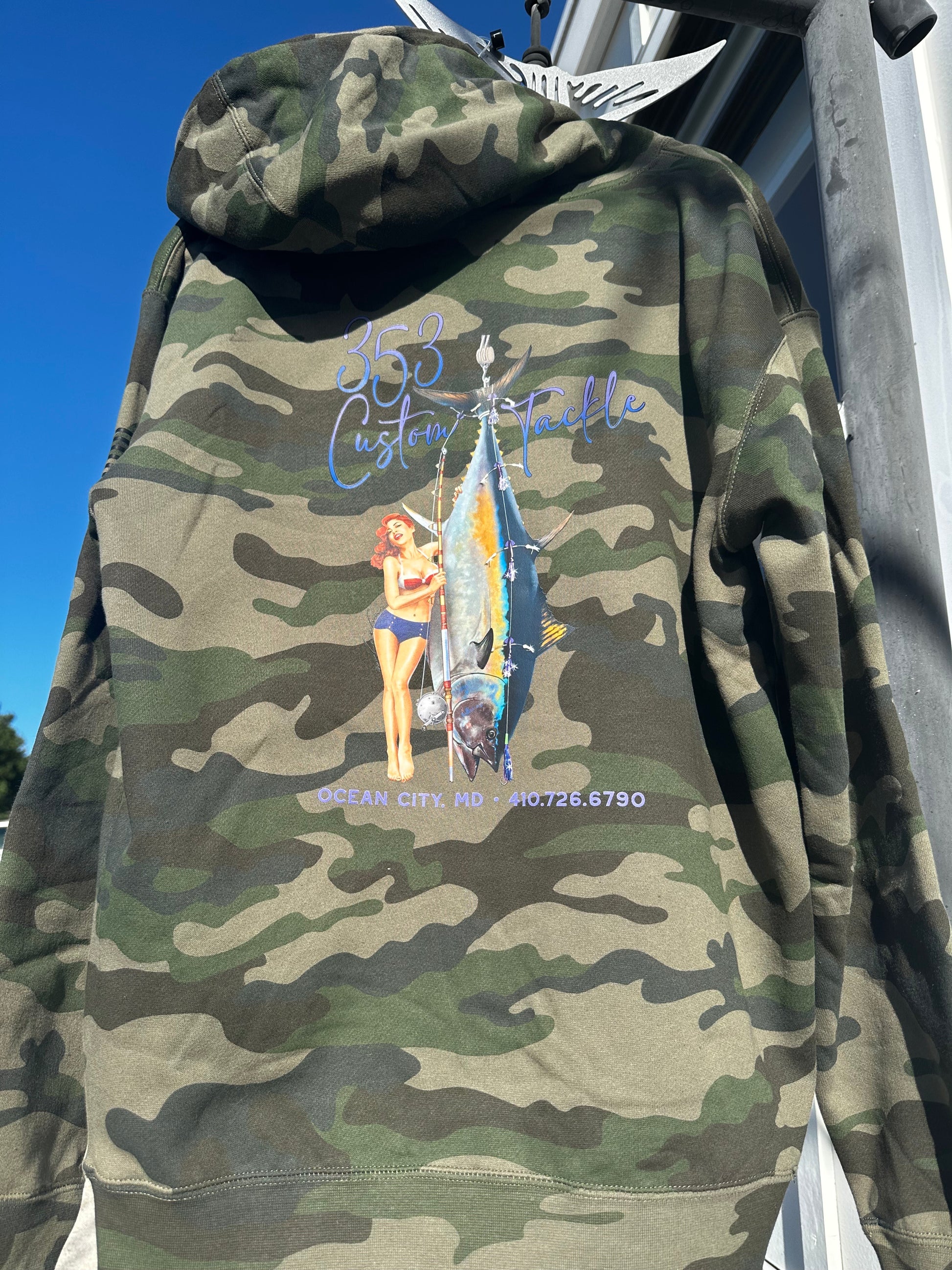 353 Custom Tackle original hoodie. Available in green camo or charcoal.