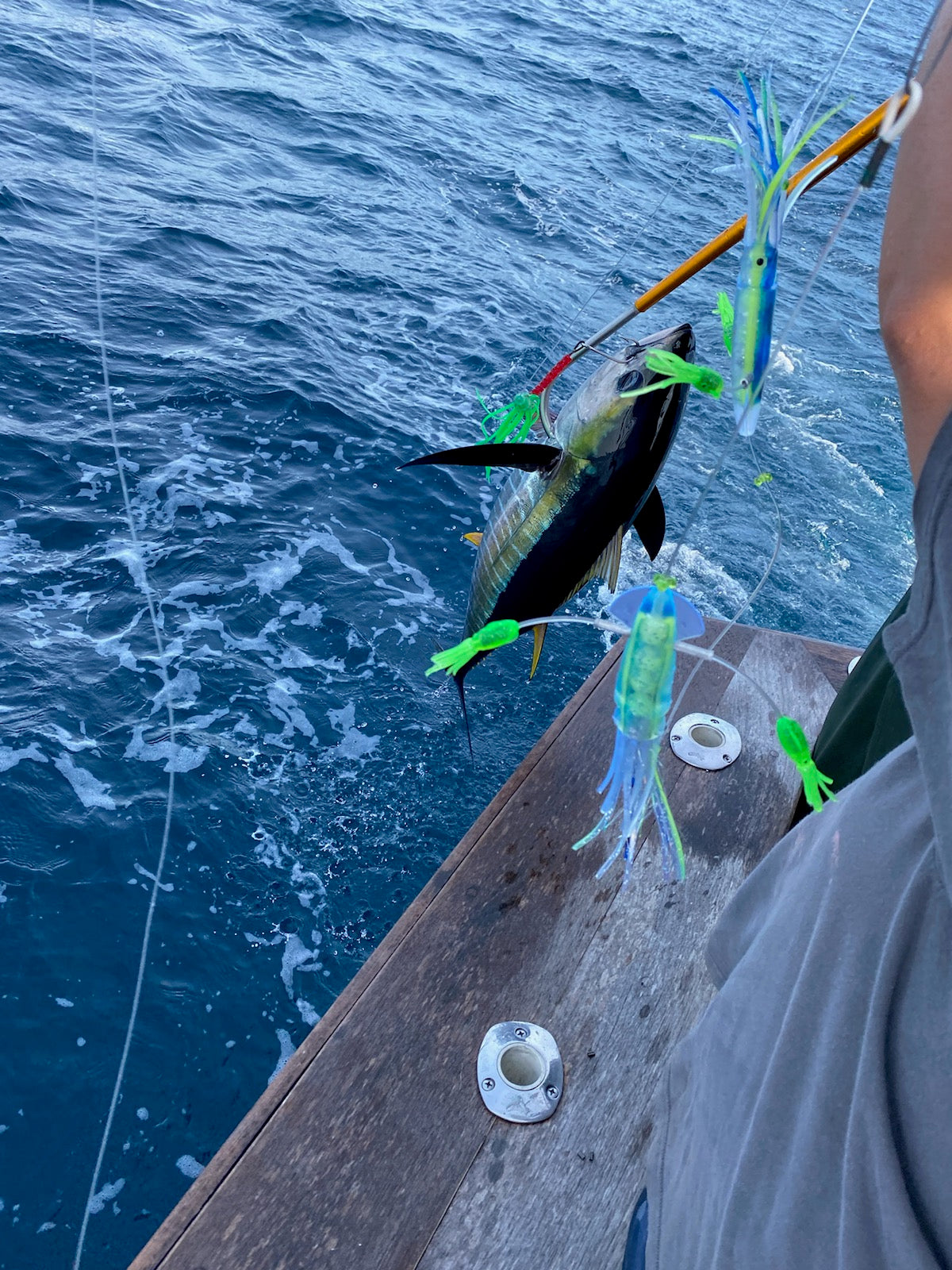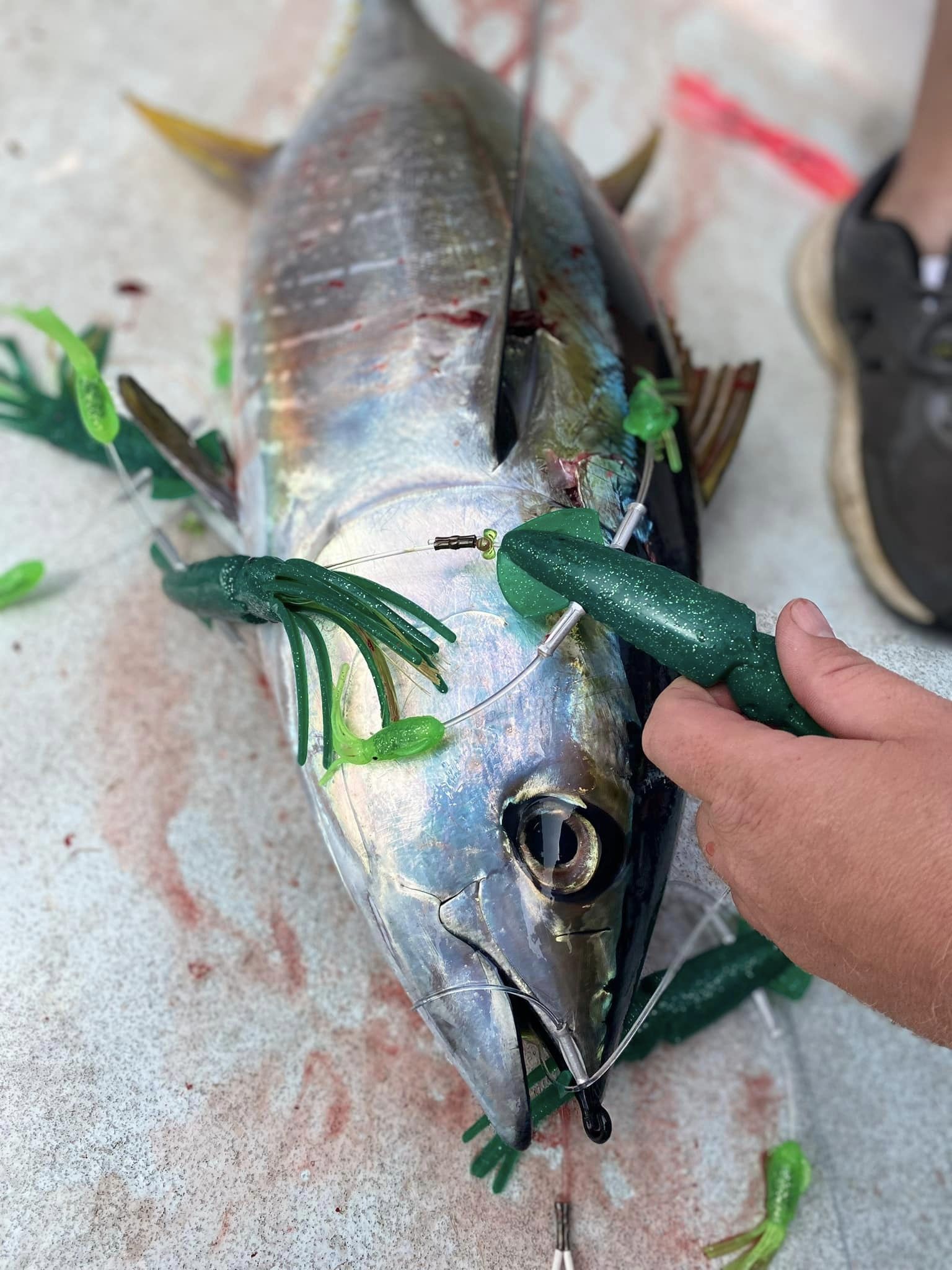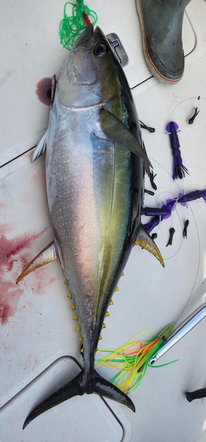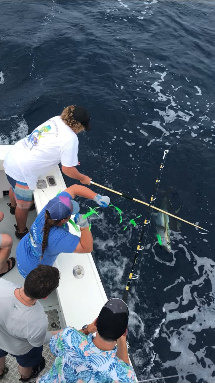 The mini flippy floppy daisy chain is universal, so you have the ability to run it as a teaser or a daisy chain. The action of the flippy floppy mimics a frenzy of baitfish at the surface. Daisy Chain comes with a stinger rigged on 175 flouro with mustad 7691 DT 9/0