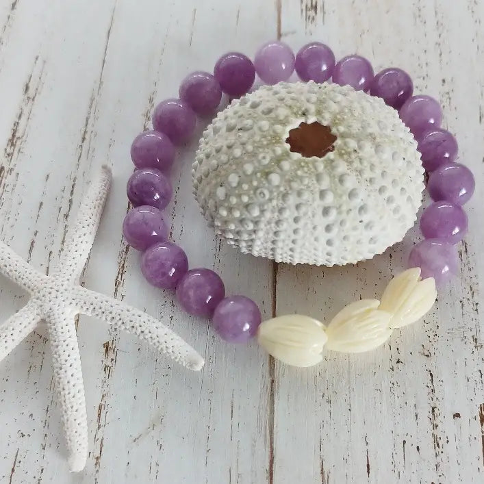 - Cloudy purple jade 8mm with cream colored pikake flowers