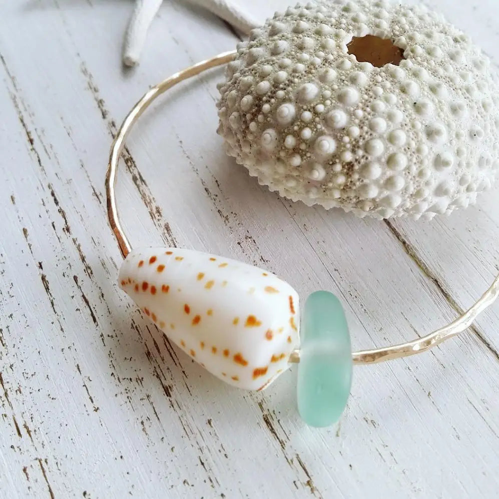 14k gold filled bangle adorned with a spotted timor coneshell and cultured sea glass